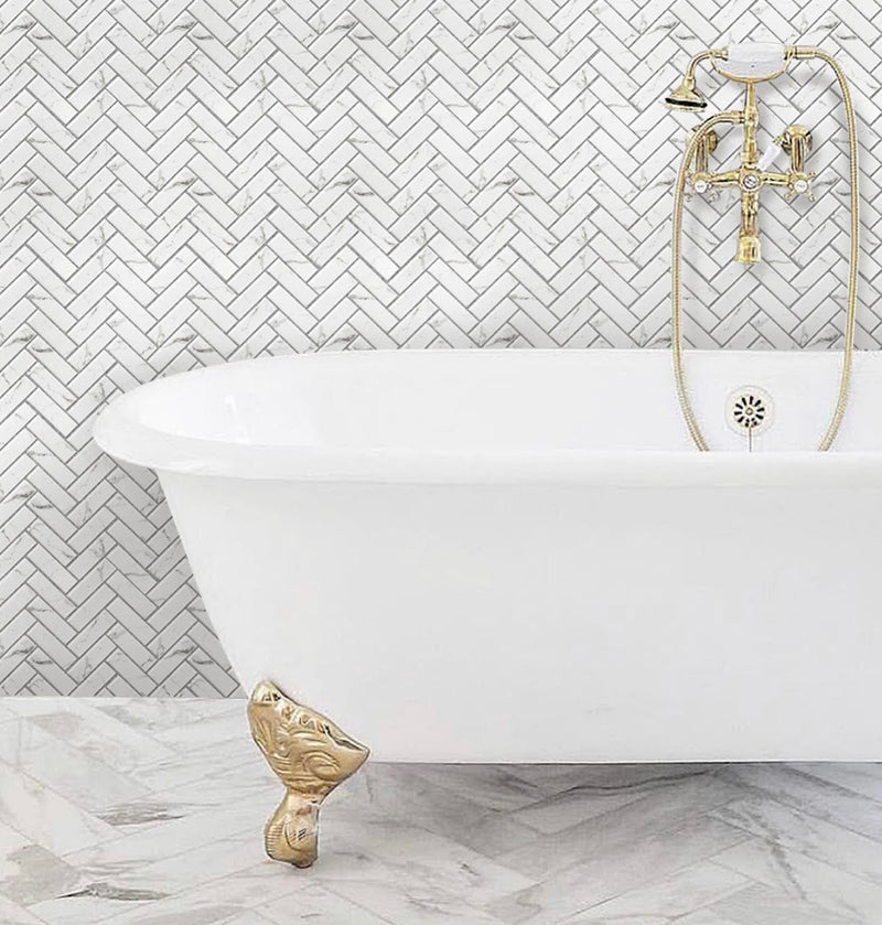Our Hummock Herringbone tile is a stunning twist on a classic look. The herringbone pattern creates dimension and interest while the variations on the white tile fit perfectly into a modern bathroom design.